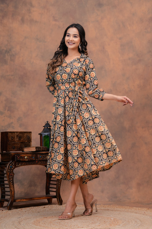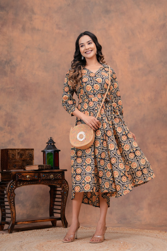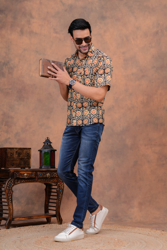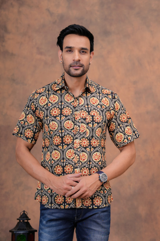 This striking couple's outfit offers a perfect blend of rich, earthy tones and traditional artisanal charm. Crafted from lightweight, breathable cotton fabric, the garments feature an intricate hand block printed design with black and warm ochre circular motifs that exude a vibrant, bohemian aesthetic. The woman's dress presents a flattering, A-line silhouette with a tie-up waist, while the man's complementary short-sleeve shirt maintains a relaxed fit, creating a perfectly synchronized look that's both comfortable and visually captivating for any casual or festive occasion.