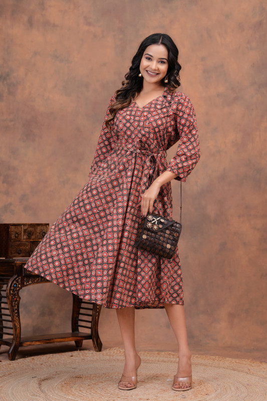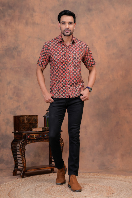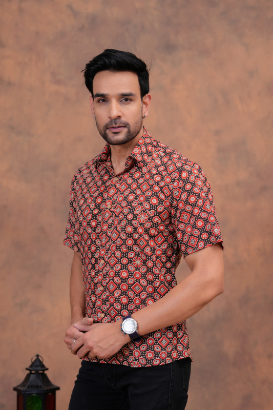 This couple is wearing a stylish and vibrant matching set that perfectly balances traditional Indian design with modern casual wear. The outfits feature a striking black and red motif, applied using classic hand block printing techniques, giving them an authentic, artisanal feel. Crafted from lightweight and breathable cotton fabric, these garments are designed for comfort and ease of movement, making them ideal for a warm weather event, a festive occasion, or a casual date night. The woman's A-line midi dress and the man's complementary short-sleeve shirt create a harmonious 'twinning' look that is both fashionable and rooted in cultural heritage