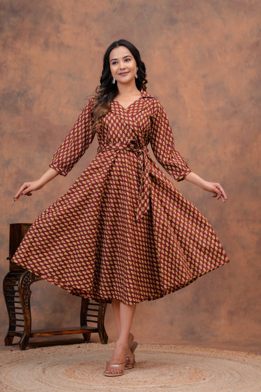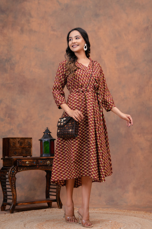 This stunning matching ensemble for couples offers a rich aesthetic that merges vibrant colors with authentic craftsmanship. The garments are crafted from lightweight, breathable cotton fabric, ensuring a comfortable fit ideal for various occasions. The striking pattern, featuring intricate motifs in deep maroon and yellow, is achieved through the traditional hand block printing technique, adding a unique, artisanal touch. The woman's A-line midi dress is stylish and flattering, while the man's complementary short-sleeve shirt provides a casual yet coordinated look, making this set a fashionable choice for any couple seeking a culturally rich and stylish outfit.