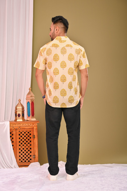 A coordinated couple's set crafted from soft, breathable cotton fabric, featuring a traditional yellow and off-white hand block printed design. The unique leaf-patterned print provides a vibrant, cheerful aesthetic, ideal for casual outings, festive occasions, or summer wear.