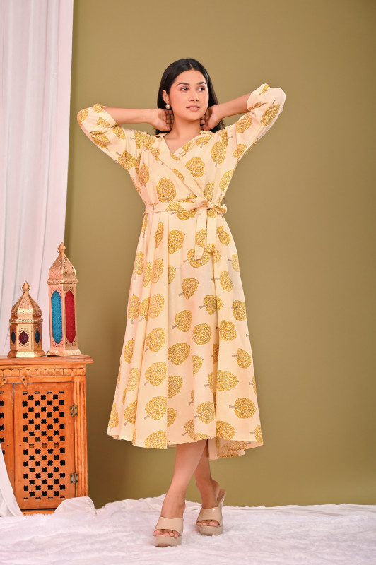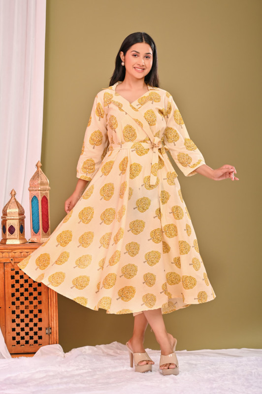 • Design & Pattern: The outfits feature intricate geometric and leaf motifs in a yellow and off-white color palette. The pattern is often applied using the traditional Indian technique of hand block printing, a process that results in unique designs celebrating artisanal skill.