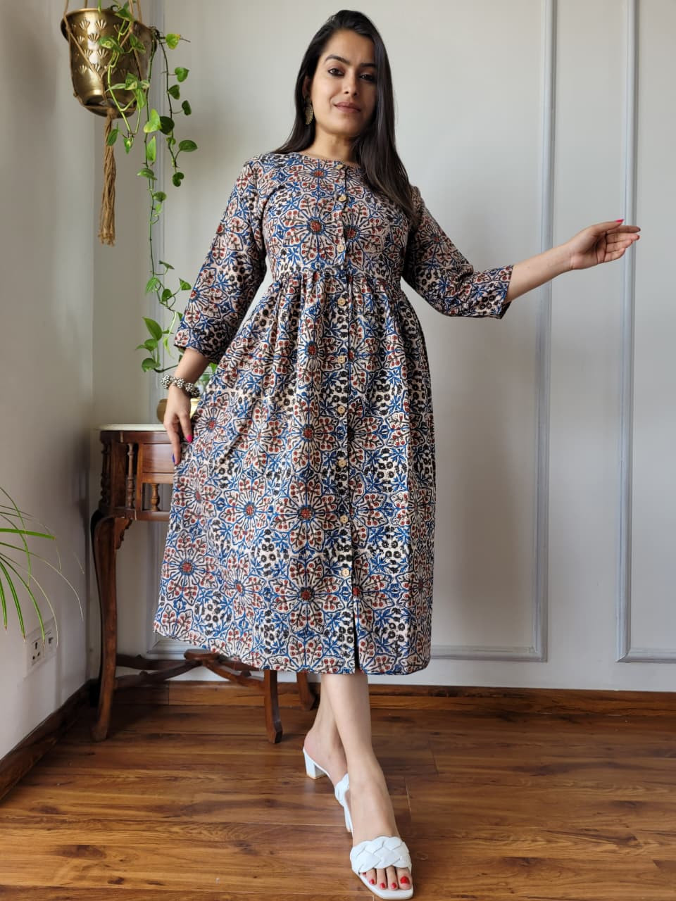 The dress features a neutral beige or off-white base color adorned with intricate floral and abstract motifs in contrasting shades of rust red and blue. These patterns are created using the time-honored hand block printing technique, where skilled artisans in regions like Rajasthan use hand-carved wooden blocks and natural dyes to stamp the fabric. This process ensures each piece is unique and carries significant cultural heritage.