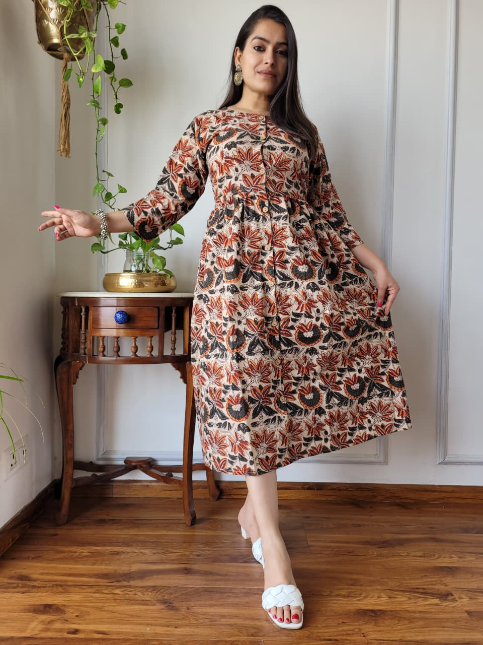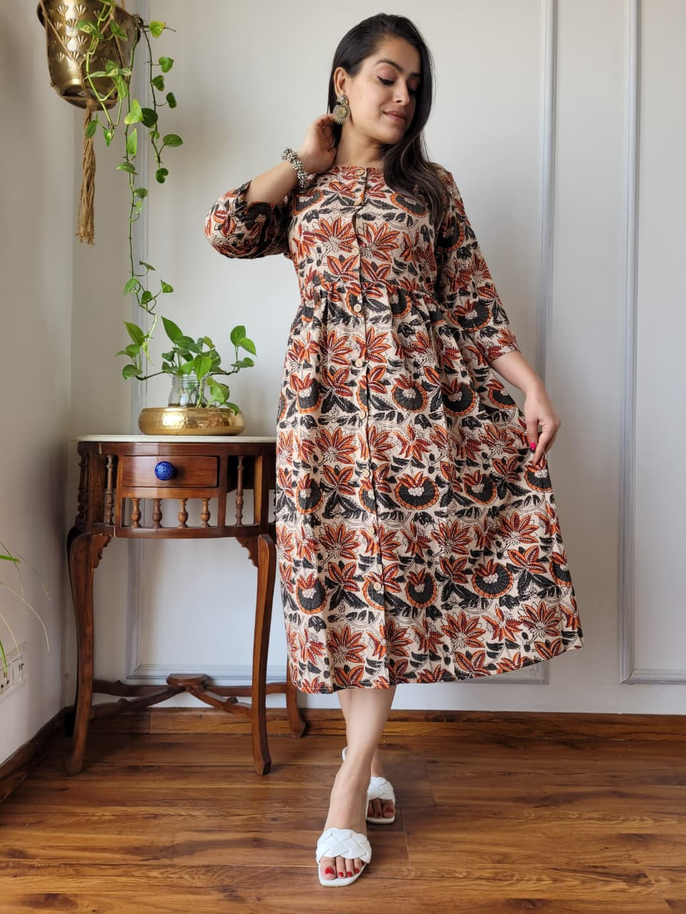 This beige and rust orange hand block printed cotton A-line dress is a sophisticated and comfortable garment that effortlessly blends traditional Indian craftsmanship with a modern silhouette. Crafted from high-quality, breathable cotton cambric fabric, it offers a soft, lightweight feel, ensuring maximum comfort for all-day wear. The base color is a neutral beige or off-white, adorned with intricate floral and botanical motifs in contrasting shades of rust orange and black. These patterns are typically applied using the time-honored hand block printing technique, a traditional artisan process from regions like Bagru, Rajasthan, that gives the garment an authentic, artisanal touch and ensures each piece is unique.