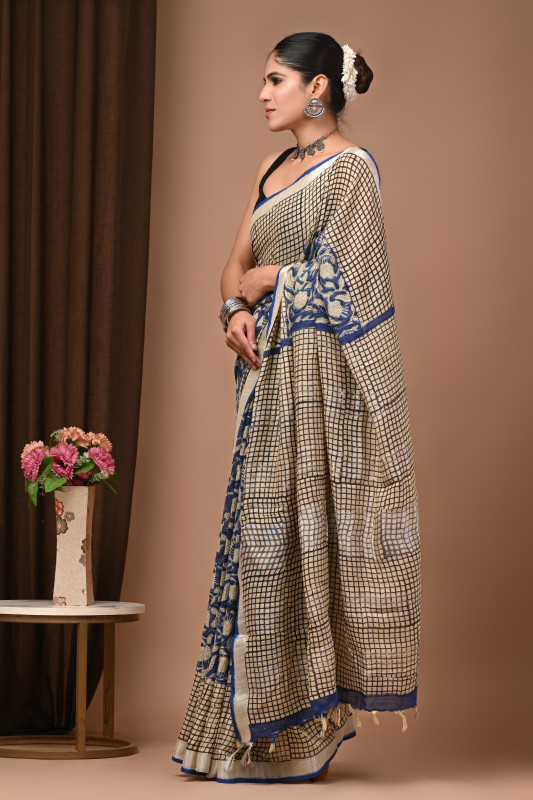 This exquisite Beige & Blue Checkered Handloom Cotton Saree with Floral Woven Pattern brings together refined elegance and traditional craftsmanship in a timeless design. The body features subtle beige and blue checkered detailing, giving the saree a structured and contemporary appeal, while the contrasting pallu and pleats showcase beautifully woven floral motifs that add richness and artistic charm. Made from soft, breathable handloom cotton, it ensures superior comfort and a graceful drape, making it ideal for long wear during festive occasions, office events, or cultural gatherings. The blue border enhances the overall sophistication, creating a perfect balance of simplicity and statement style. This saree is a versatile addition to any wardrobe, offering both comfort and classic beauty in every fold.