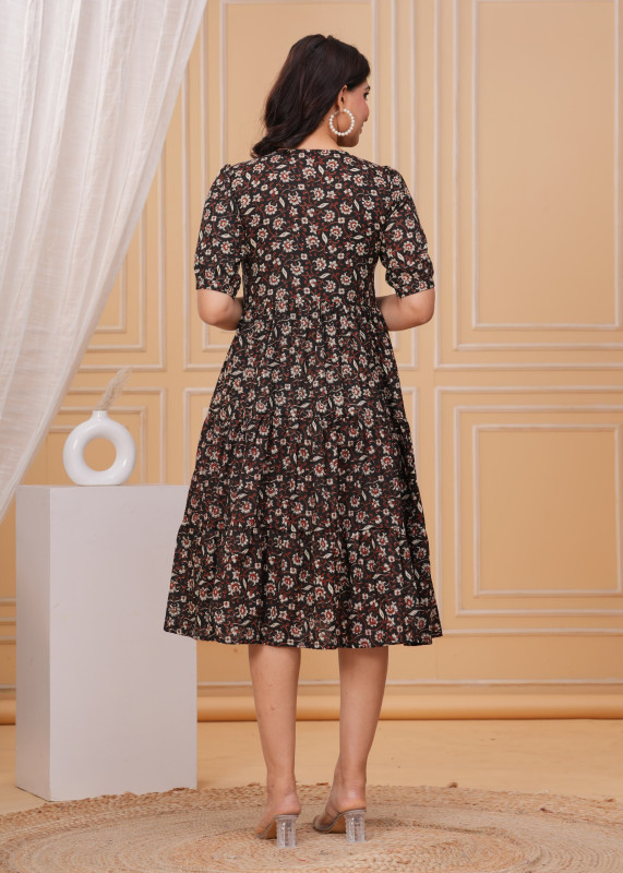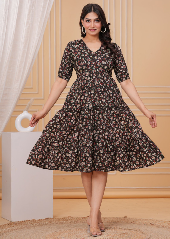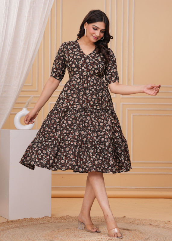 This sophisticated black dress features a dense all-over floral print in earthy red and white tones that adds a classic charm to the modern silhouette. Designed with a flattering V-neckline and short sleeves, the dress flows into a tiered skirt that offers movement and a comfortable fit for all-day wear. The combination of the dark base with the intricate flower pattern makes this one-piece a versatile choice for casual outings, office wear, or relaxed weekend gatherings.