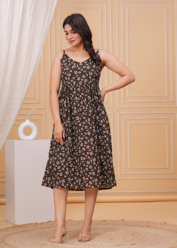 Exude effortless summer charm with this chic black sleeveless midi dress, featuring a timeless ditsy floral print in earthy tones. Designed with a flattering V-neckline and delicate spaghetti straps, the dress boasts a gathered waist that transitions into a flowy A-line skirt, providing a comfortable and breezy silhouette. Perfect for casual outings or brunch dates, this versatile one-piece pairs beautifully with heels or sandals for a refined yet relaxed look.