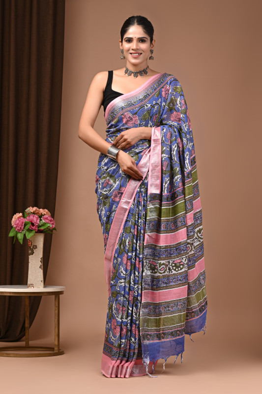 This Blue Floral Hand Block Printed Cotton Saree with Pink Border and Multicolor Patterned Pallu beautifully captures the essence of traditional Indian craftsmanship fused with modern elegance, making it a perfect choice for those who appreciate both style and comfort. Crafted from soft, breathable cotton fabric, this saree offers an effortless drape and all-day comfort, ideal for festive occasions, casual outings, or formal events. The soothing blue base is adorned with intricate floral motifs created using the age-old hand block printing technique, reflecting the skill and dedication of skilled artisans. The delicate pink border adds a subtle yet striking contrast that enhances the overall appeal, while the vibrant multicolor patterned pallu adds depth and richness to the design with its detailed ethnic patterns and harmonious color palette. This saree effortlessly combines comfort, elegance, and traditional artistry, making it a timeless addition to any wardrobe and perfect for accessorizing with both traditional jewelry and contemporary styles.