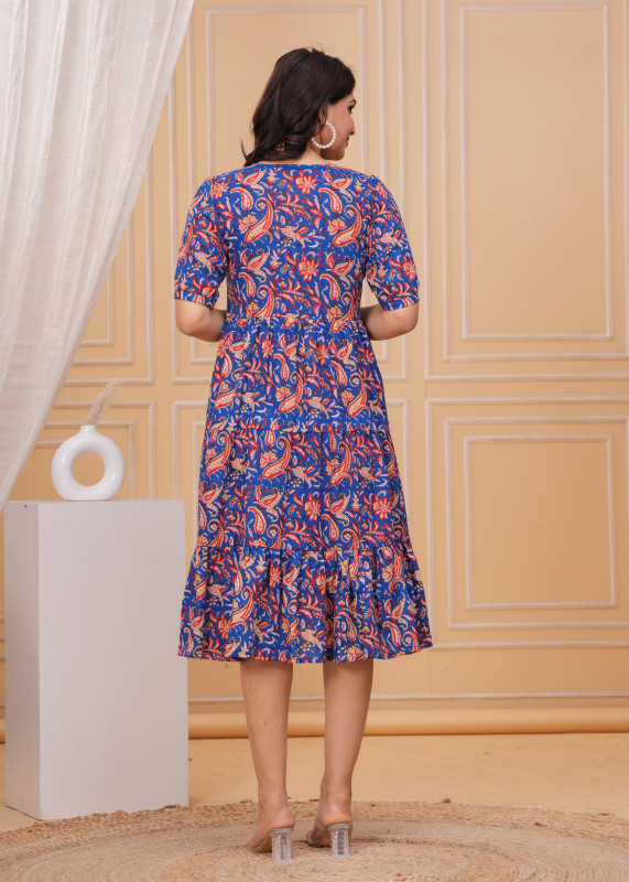 This elegant royal blue dress features a vibrant red and beige paisley floral print that gives it a beautiful ethnic fusion look perfect for casual wear. The design includes a flattering V-neckline and comfortable short sleeves with a relaxed tiered skirt that adds a breezy and playful volume to the silhouette. Made from soft fabric, this knee-length one-piece combines style and comfort effortlessly, making it an excellent choice for daytime outings or summer gatherings.