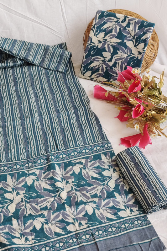 The design showcases the intricate artistry of traditional Indian hand block printing, a heritage craft from regions like Rajasthan. The top fabric features delicate floral and leaf motifs spread across the surface, while the bottom material is adorned with complementary geometric stripes and circular patterns, ensuring a harmonious and balanced look once stitched. The lightweight dupatta, likely made from soft mulmul cotton, ties the entire ensemble together with a blend of these beautiful prints and a contrasting border. This versatile unstitched set is ideal for creating a personalized outfit suitable for everyday wear, casual outings, or even semi-formal occasions, offering a chic blend of timeless traditional charm and modern appeal
