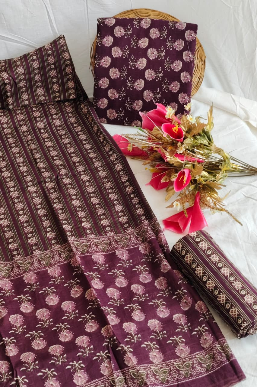 This Classic Purple Hand Block Printed Unstitched Suit Material for women is crafted from premium, breathable cotton fabric, ensuring both comfort and style. The set includes generous 2.5-meter lengths each for the top, bottom, and dupatta, offering ample material to be tailored to your desired fit and style. The beautiful wine or purple base color serves as a rich canvas for the intricate white and off-white hand block prints.