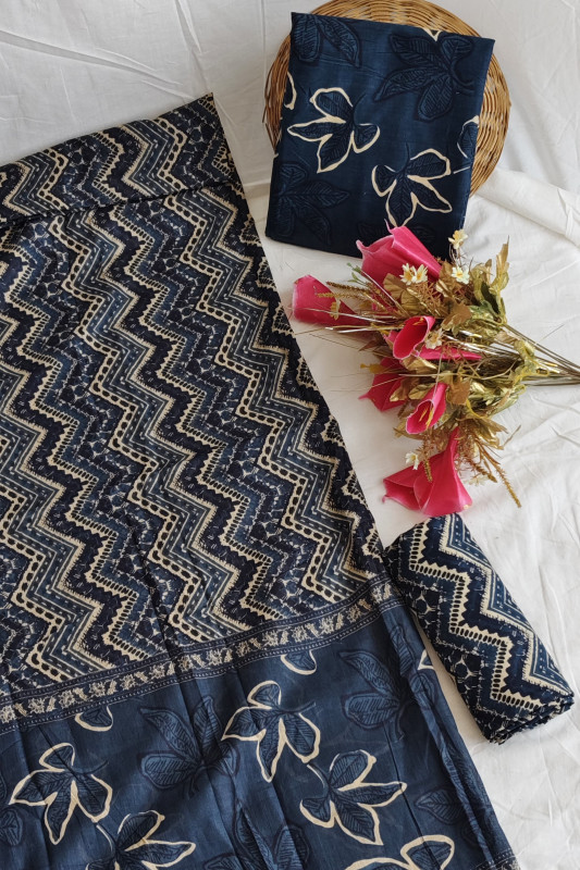 This elegant ensemble features a rich, dark blue color palette, showcasing the intricate artistry of hand block printing on premium, breathable cotton fabric. This is an unstitched suit material specifically designed for women, providing versatility for personalized tailoring to achieve a comfortable and flattering fit.