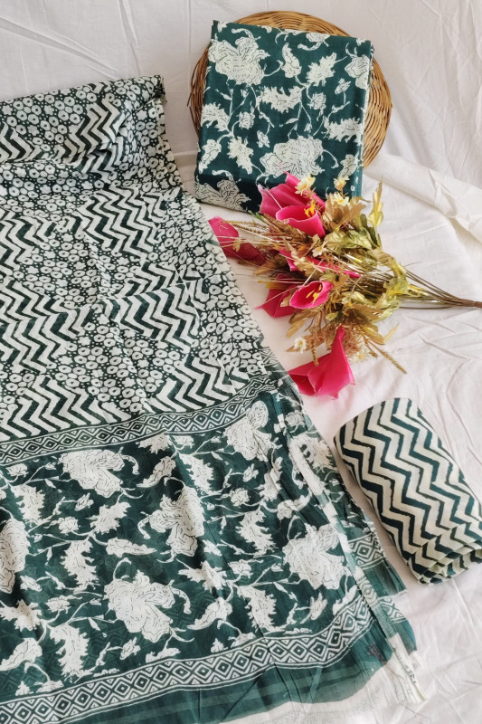 Dark Teal Green Hand Printed Cotton unstitched suit Material for Women 2.5 Mtr top and 2.5 Mtr Bottom and 2.5 Mtr Dupatta
