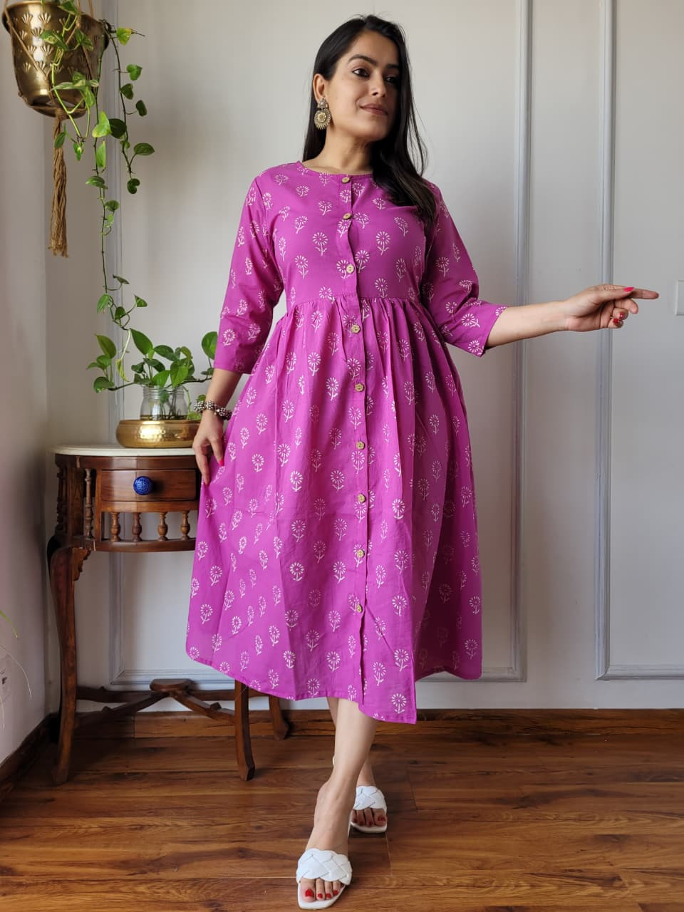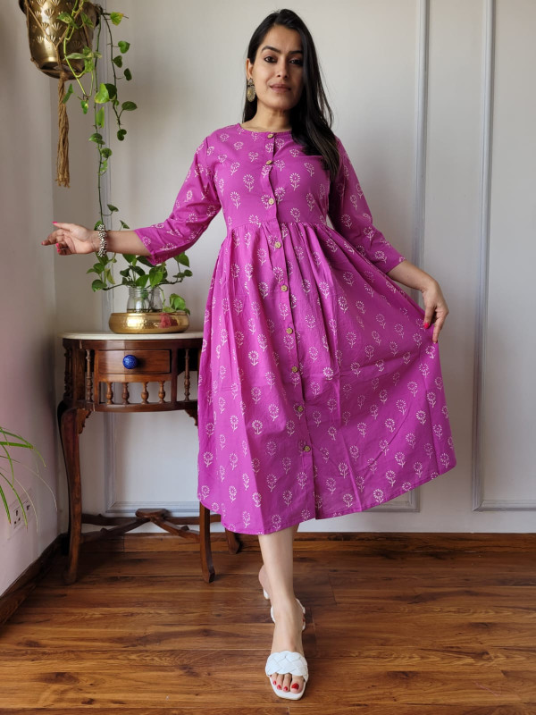 This fuchsia pink and white cotton hand block printed A-line one-piece dress is a vibrant and comfortable garment that effortlessly combines traditional Indian craftsmanship with a modern, flattering silhouette. Crafted from high-quality, breathable cotton cambric fabric, the dress offers a soft, lightweight feel, ensuring maximum comfort for all-day wear. The dress features a rich fuchsia pink base color adorned with intricate white (or off-white) floral or botanical motifs. These patterns are created using the time-honored hand block printing technique, a traditional artisan process that gives the garment an authentic, artisanal touch. The design follows a flattering A-line silhouette