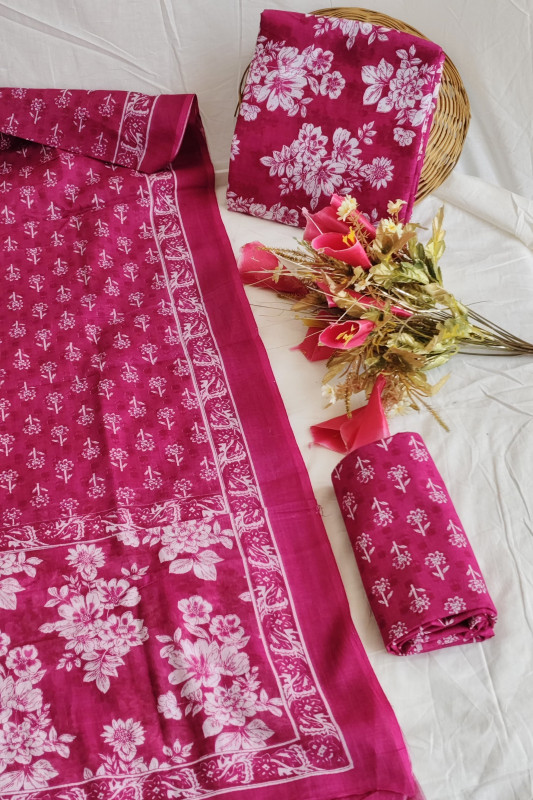 Fuchsia Pink and White Floral Cotton Unstitched Suit Material, a captivating blend of traditional charm and modern flair. Crafted from premium, breathable cotton, this versatile ensemble offers supreme comfort and a luxurious feel against the skin, perfect for any season. The material features intricate hand block printed floral patterns, showcasing authentic artisanal craftsmanship and a timeless aesthetic. This complete unstitched set provides everything needed to create a personalized outfit, including a generous 2.5-meter top fabric, a coordinating 2.5-meter bottom fabric, and a graceful 2.5-meter dupatta