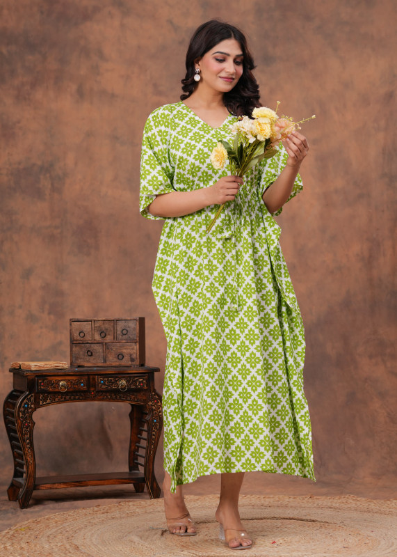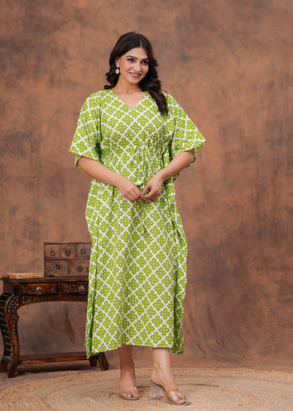 This stylish and comfortable kaftan is often crafted from lightweight, breathable fabrics like cotton or crepe, making it ideal for casual wear, resort wear, or even as a nightdress. The design boasts a flowing, loose-fitting silhouette with kimono or kaftan sleeves and a V-neckline. It commonly features an adjustable drawstring or tie-up detail at the waist for a customizable and flattering fit, as seen in the image. The vibrant lime green and crisp white color combination creates a refreshing and eye-catching look, while the intricate geometric or block printed motifs add a touch of everyday sophistication. This versatile garment can range from midi to maxi length and is a popular choice for a relaxed yet chic ensemble.