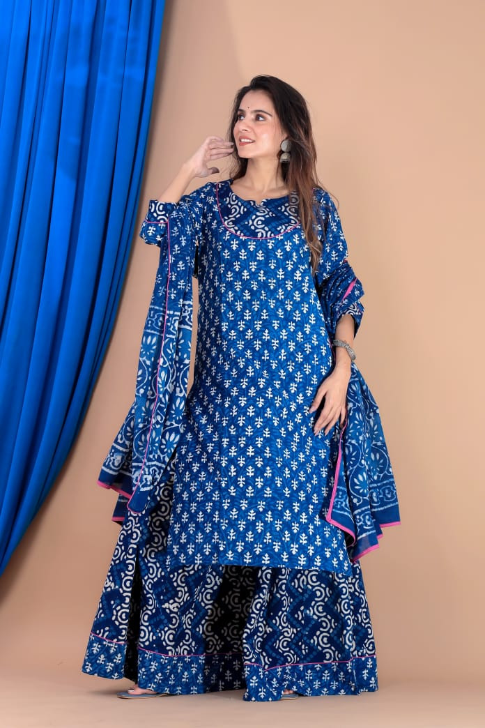 This elegant two-piece ethnic ensemble showcases a long, A-line or straight-fit kurta in a rich indigo blue hue, adorned with intricate Dabu hand-block printed white motifs across the fabric. The kurta typically features three-quarter sleeves and a round or sweetheart neckline. It is paired with a matching, flared skirt or elasticated palazzo pants that feature complementary block print patterns along their hem, creating a cohesive and stylish look. The outfit's design is rooted in artisanal craftsmanship, highlighting India's rich textile heritage. Made predominantly from breathable cotton fabric, this set offers both comfort and a sophisticated, festive or casual appearance.