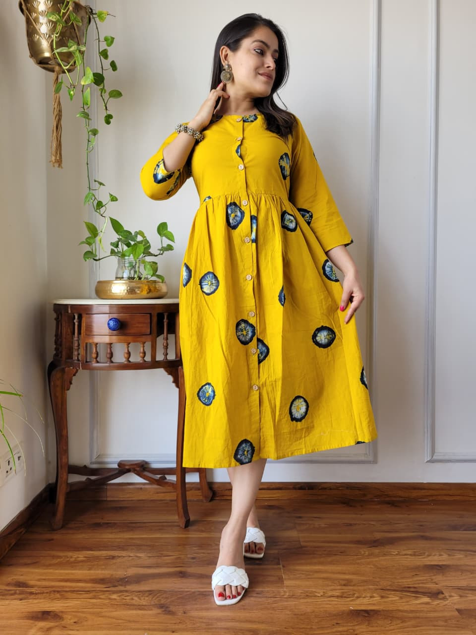 The dress features a vibrant mustard yellow base adorned with traditional Bagru hand block prints, typically in circular motifs of blue/black ink. This ancient technique uses hand-carved wooden blocks and often employs eco-friendly, natural dyes. It is designed with a comfortable, relaxed A-line or paneled silhouette that gathers at the waist. The dress in the image has a mandarin collar, a front button placket closure, and three-quarter length sleeves. Many similar styles, including this one, are advertised as having convenient side pockets. Each piece is unique due to the handcrafted nature of the printing process, which carries the rich cultural heritage of Rajasthani artisans.