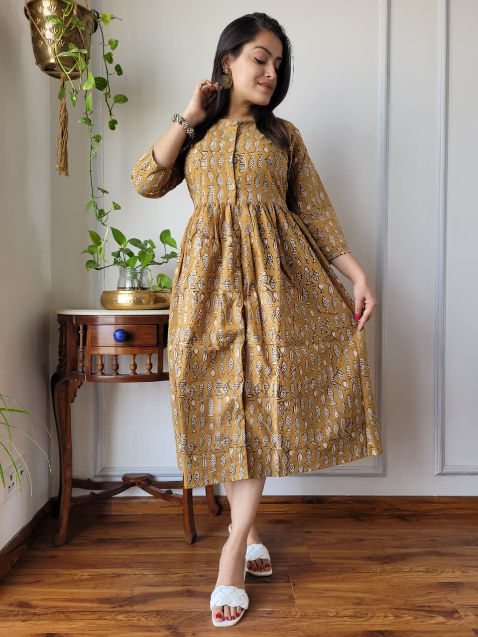 This mustard yellow hand block printed cotton A-line dress is a charming and comfortable garment that seamlessly blends traditional Indian craftsmanship with a modern, flattering silhouette. Crafted from premium, breathable cotton cambric fabric, the dress offers a soft, lightweight feel, ensuring maximum comfort for all-day wear. The dress features a rich mustard yellow base color adorned with intricate fish motifs in contrasting white and blue hues. These patterns are created using the time-honored hand block printing technique, a traditional artisan process that involves skilled craftspeople using hand-carved wooden blocks to stamp patterns onto the fabric, ensuring each piece is unique and carries cultural heritage from regions like Rajasthan. The design follows a flattering A-line silhouette, meaning it is fitted at the bodice and flares out gently toward the hem, providing graceful movement and a relaxed yet elegant fit. Key design details include a classic round neckline, a functional partial front button placket closure, and three-quarter length sleeves. Many similar styles also incorporate convenient side pockets for added practicality. This versatile cotton dress is ideal for a variety of settings, from casual outings and brunches to office wear or evening gatherings.