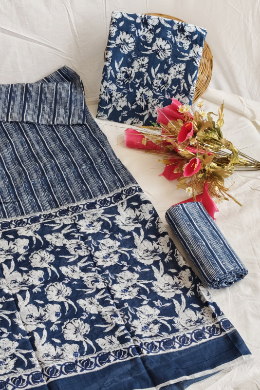 This unstitched suit material is an attractive ethnic collection for women, crafted from Navy blue and white printed cotton fabric that you can tailor to your personal preference. The set is designed to provide all-day comfort and includes ample fabric for the top, bottom, and dupatta, offering versatility in styling.
