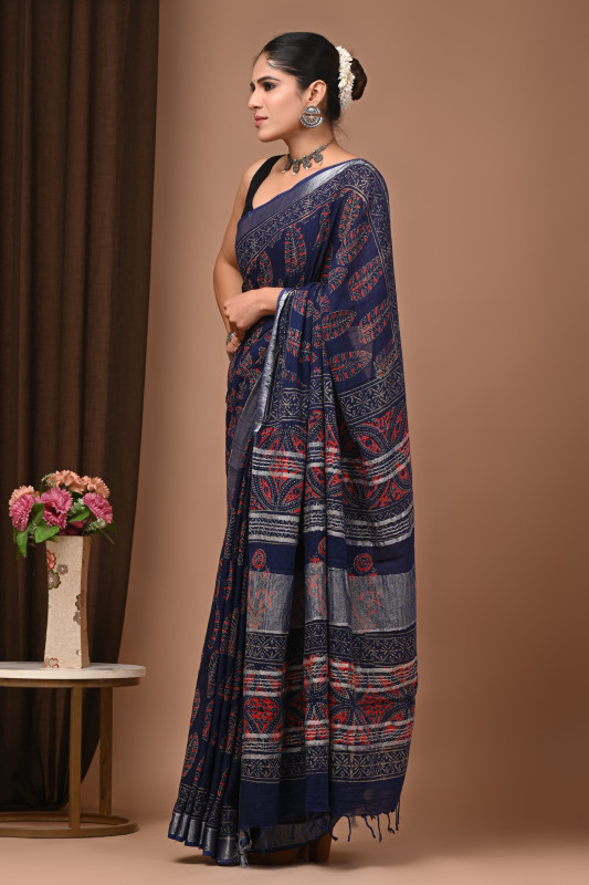 This enchanting Navy Blue Soft Linen Fabric Saree is a beautiful amalgamation of the finesse of Indian handicraft and contemporary design. The deep, rich Navy Blue color of the saree provides a stunning backdrop, highlighting the intricate patterns of the Hand Block Print done upon it.