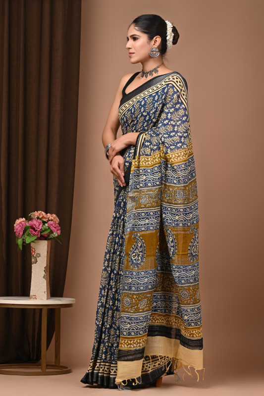 This striking saree is crafted from high-quality, comfortable Soft Linen fabric, offering an excellent drape and a luxurious, lightweight feel. The base color is a deep Navy Blue/Indigo, providing a rich and sophisticated canvas for the intricate designs.