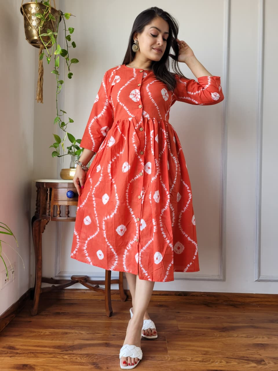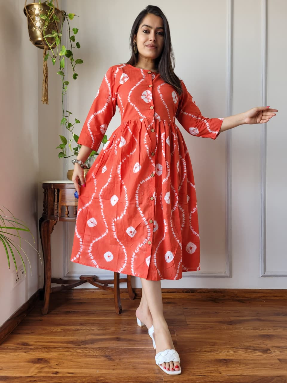 This Orange, Yellow, and White Tie-Dye Cotton One Piece Dress with a front button placket is a vibrant and comfortable garment that effortlessly combines a traditional Indian tie-dye technique with a modern, flared silhouette. Crafted from high-quality, breathable cotton cambric fabric, it is designed for maximum comfort and is ideal for warm weather or casual everyday wear.