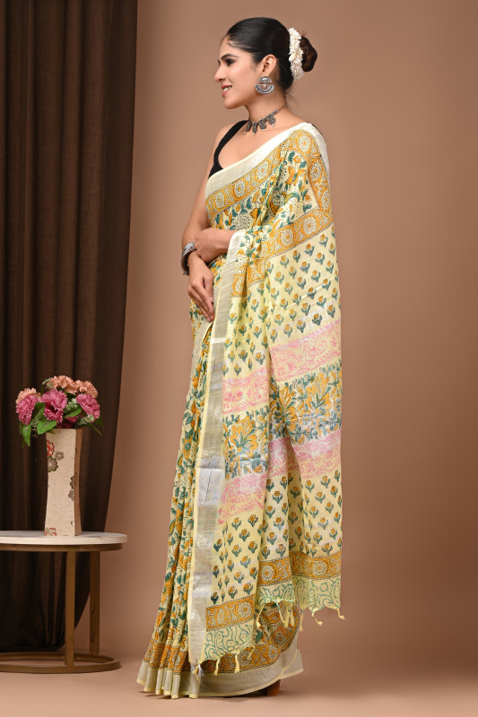 This elegant Pastel Yellow Handblock Printed Cotton Saree with Multicolor Floral & Stripe Pattern beautifully showcases traditional craftsmanship blended with soft, soothing tones, making it a graceful choice for both casual and festive wear. Crafted from premium breathable cotton, the saree features intricate handblock floral motifs in shades of green, orange, and blue, complemented by delicate striped panels and a finely detailed border that adds depth and richness to the overall look. The pastel base enhances the vibrancy of the prints, while the lightweight fabric drapes effortlessly, offering all-day comfort. Perfect for daytime outings, cultural events, or elegant gatherings, this saree brings together charm, comfort, and timeless artistry in one exquisite piece.