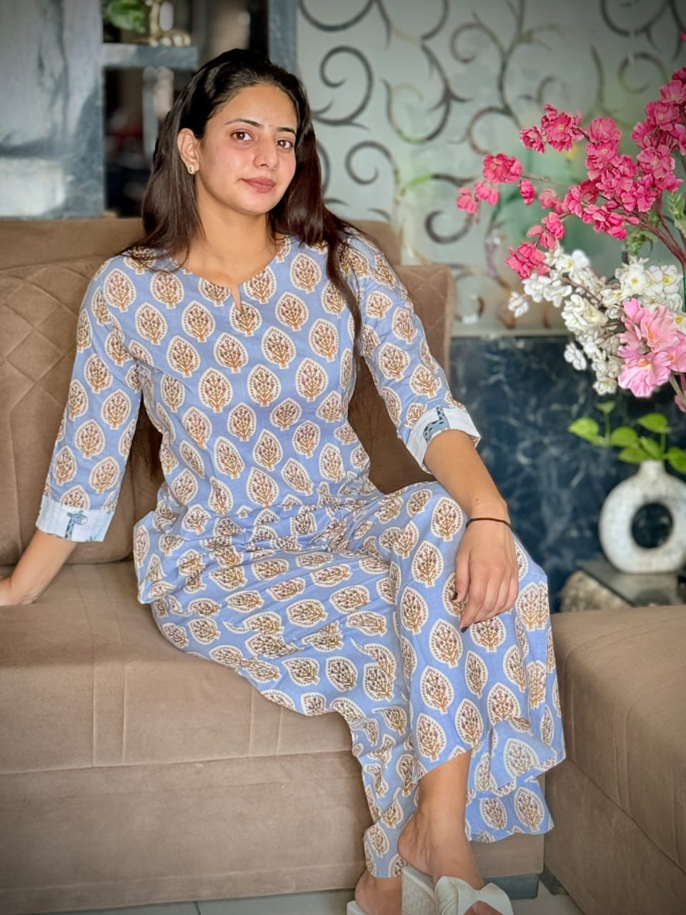 "Step into a world of effortless elegance and unmatched comfort with this stunning Periwinkle Blue Botanical Co-ord Set. Perfectly capturing the essence of modern ethnic fusion, this two-piece ensemble features a soothing pastel blue canvas adorned with an intricate, repeating leaf motif in earthy shades of amber and cream. The top is designed as a relaxed-fit tunic featuring a modest notch neckline and chic three-quarter sleeves finished with a smart turned-up cuff. It is paired with matching straight-cut trousers that offer a flattering silhouette without compromising on movement.