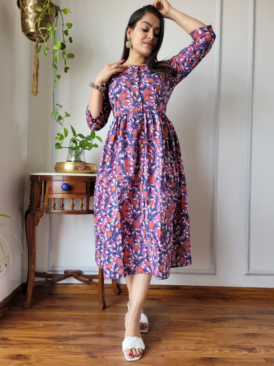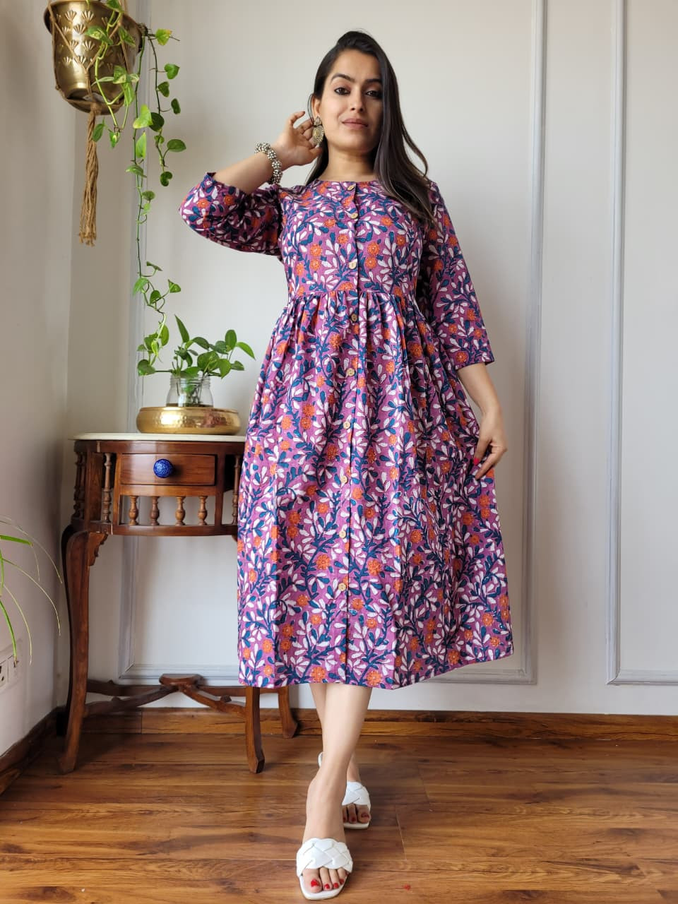 This purple and blue floral hand block printed cotton A-line one piece dress is a vibrant and comfortable garment that seamlessly blends traditional Indian craftsmanship with a modern, flattering silhouette. Crafted from high-quality, breathable cotton cambric fabric, the dress offers a soft, lightweight feel, ensuring maximum comfort for all-day wear. The base color features rich shades of purple and blue, adorned with intricate floral and botanical motifs highlighted by pops of contrasting orange hues. These patterns are typically created using the time-honored hand block printing technique, a traditional artisan process that gives the garment an authentic, artisanal touch and connects it to the rich textile heritage of regions like Rajasthan