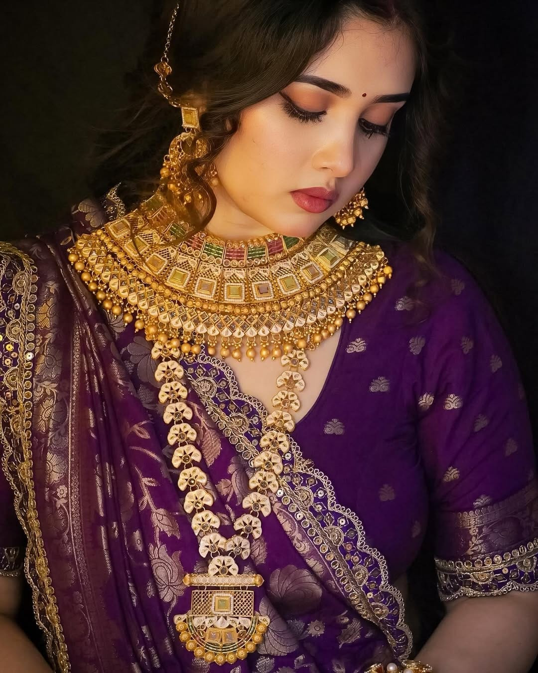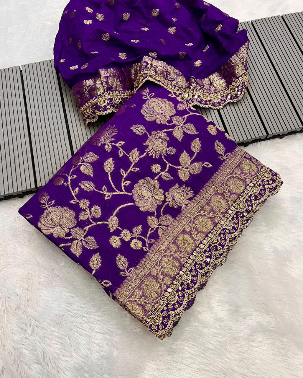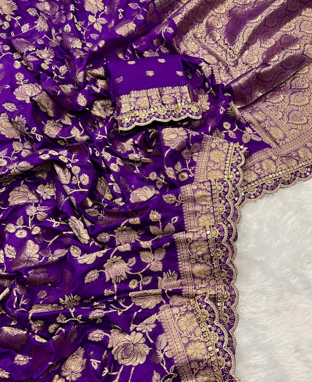 This is a stunning example of a Khaddi Georgette saree, elegantly crafted in a vibrant purple hue accented with intricate gold work. The material itself is known for its light, flowy drape and soft texture, which complements the rich, traditional design. The entire fabric is adorned with a dense, all-over floral brocade pattern, often referred to as "flower jaal" or "bootidaar," meticulously woven using metallic zari threads. This detailed weaving technique creates a luxurious, raised effect that catches the light beautifully. The saree features a heavily embellished border and pallu (the decorative end piece), typically finished with delicate scalloped or piped edges, adding a touch of traditional opulence ideal for formal occasions and celebrations. The accompanying blouse piece usually mirrors the border design, ensuring a cohesive and elegant ensemble.