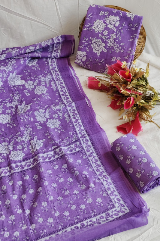The design is a testament to traditional Indian artistry, utilizing a meticulous hand block printing technique. The entire ensemble is covered in intricate floral and leaf motifs, with white patterns stamped repeatedly across the rich purple background. This classic design is often associated with popular textile traditions like Sanganeri or Bagru prints, known for their detailed work and enduring appeal. The resulting garment is perfect for warm weather, blending style, cultural heritage, and comfort seamlessly