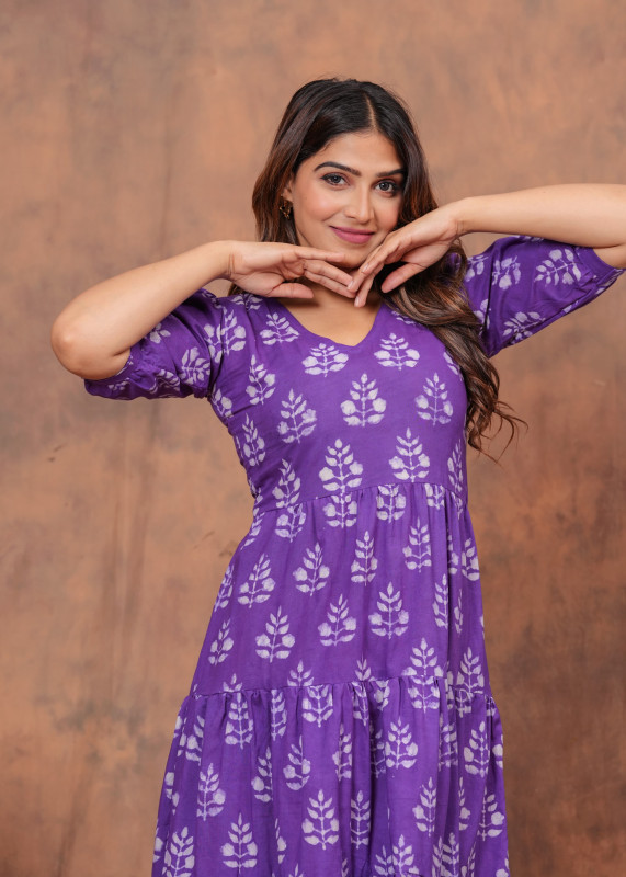 Brighten up your everyday style with this vibrant purple midi dress featuring a delicate white leaf print arranged in a structured pattern. The design includes a flattering V-neckline and playful short puff sleeves that complement the gathered waist and flowy tiered skirt. Perfect for casual outings or brunch dates this comfortable one-piece offers a breezy silhouette that pairs effortlessly with simple sandals or heels for a chic and lively look.
