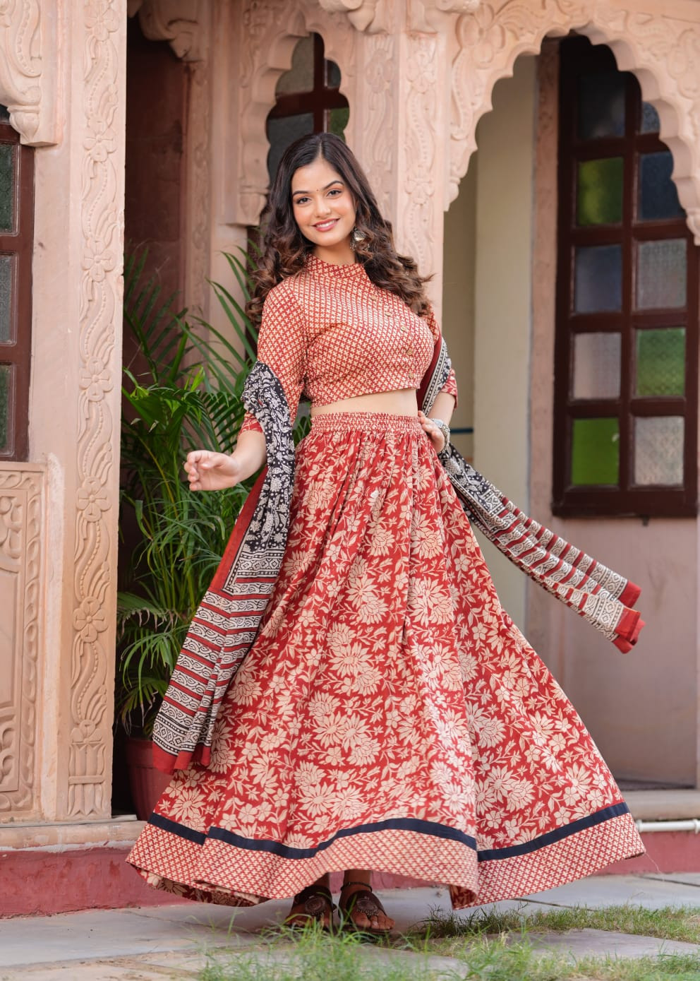 This exquisite ethnic set is crafted from premium cotton and features a traditional red floral Ajrakh block print across the lehenga and choli. The outfit includes a mandarin collar crop top choli with a button-down front, measuring 15 to 16 inches in length and available in sizes 36 to 46 (S to 3XL). The coordinating lehenga skirt is 40 inches long and is designed with 28 kalis to provide a grand 5.5-meter flair that creates an elegant drape. Adding a sophisticated contrast, the set comes with a 2.5-meter black dupatta featuring intricate botanical patterns and a matching red border. This breathable and stylish ensemble is a perfect choice for weddings, cultural festivals, or special evening occasions where you want to showcase traditional craftsmanship.