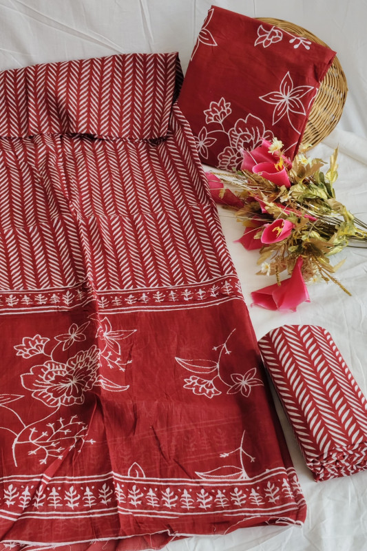 Red Hand Block Print Cotton unstitched suit Material for Women 2.5 Mtr top and 2.5 Mtr Bottom and  2.5 Mtr Dupatta