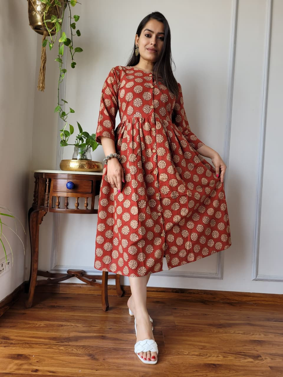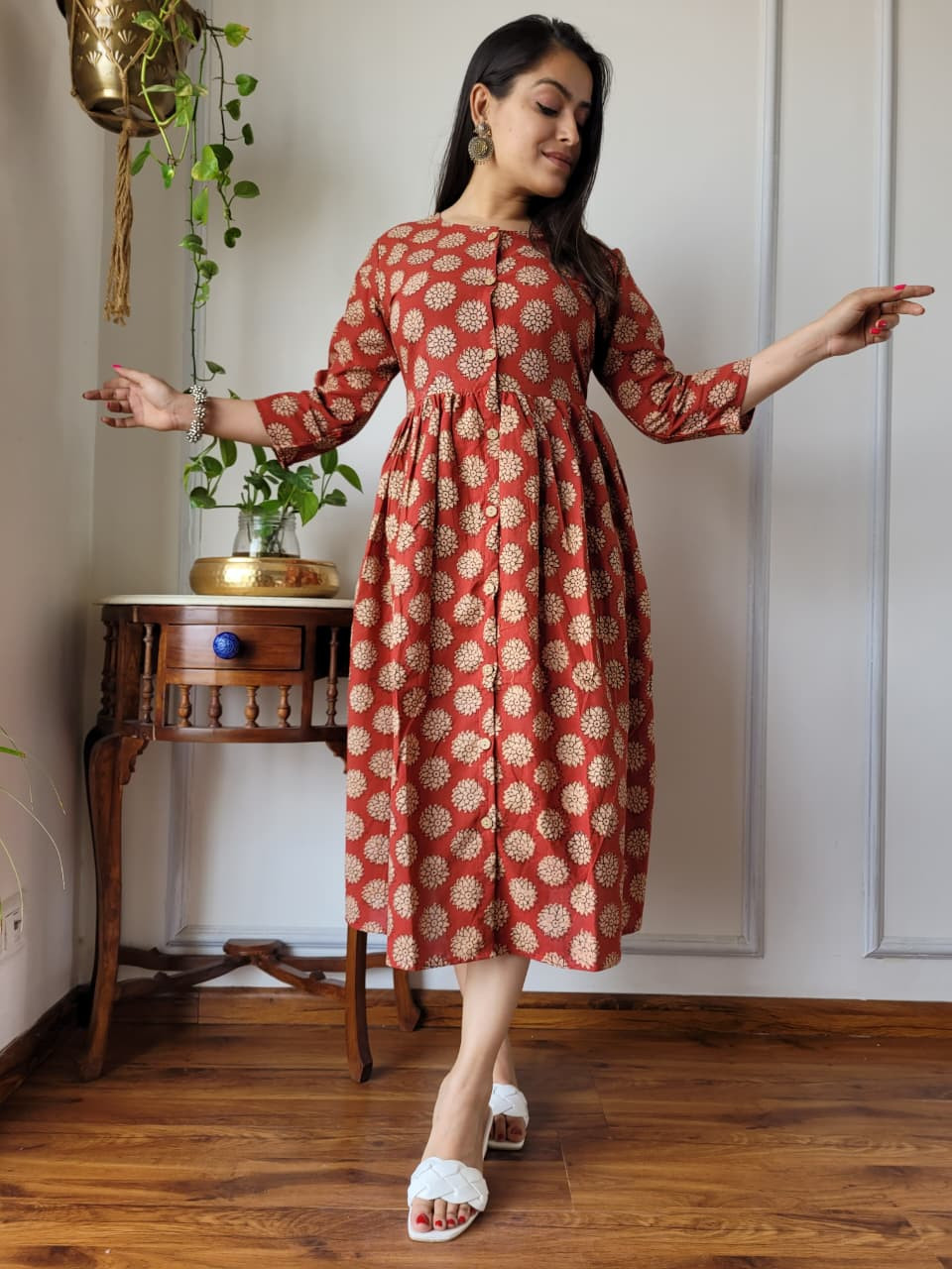 This Terracotta Red Hand Block Printed Cotton A-Line One Piece Dress is a striking and comfortable garment that beautifully encapsulates traditional Indian craftsmanship in a modern silhouette. Crafted from high-quality, breathable cotton cambric fabric, it offers a soft, lightweight feel, making it ideal for all-day wear.