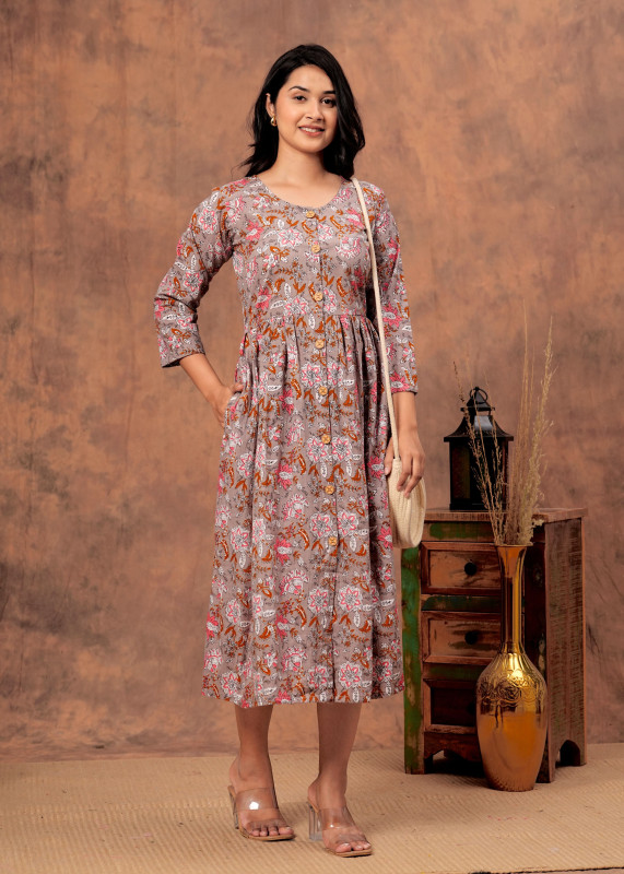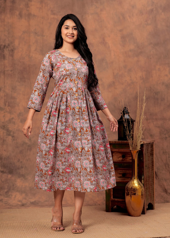 The design features a flattering fit-and-flare silhouette (Anarkali style) that fits comfortably at the bodice and gathers at the high waist to create a voluminous, flowing skirt. Detailed with a functional wooden button placket running down the front and modest 3/4th length sleeves, these dresses are perfect for office wear, casual outings, or daytime events.