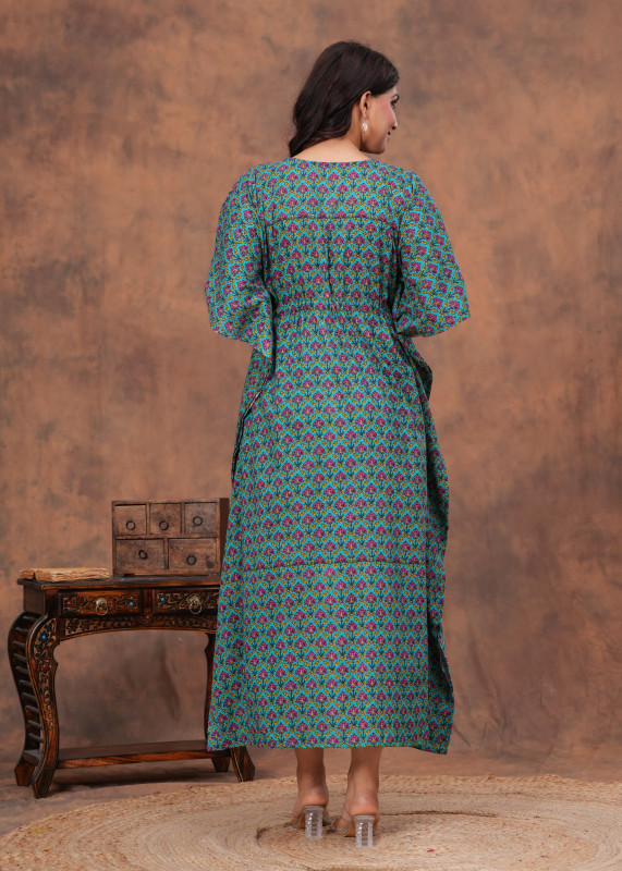 Turquoise Floral Print Cotton Kaftan