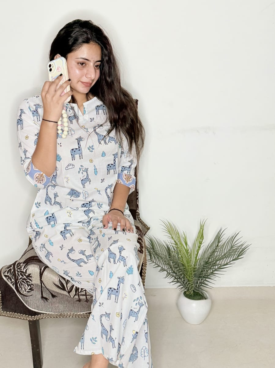 The set features a charming giraffe doodle print in a serene blue and white palette, offering a playful yet sophisticated look. The top (Length: 28–31 inches) is designed with a relaxed fit and a classic neckline, complemented by 17-inch sleeves that provide the perfect balance of coverage and freedom of movement. Matching the top is a pair of ergonomically tailored pyjamas (Length: 38 inches) that sit comfortably on the waist, ensuring a flattering silhouette for various body types.