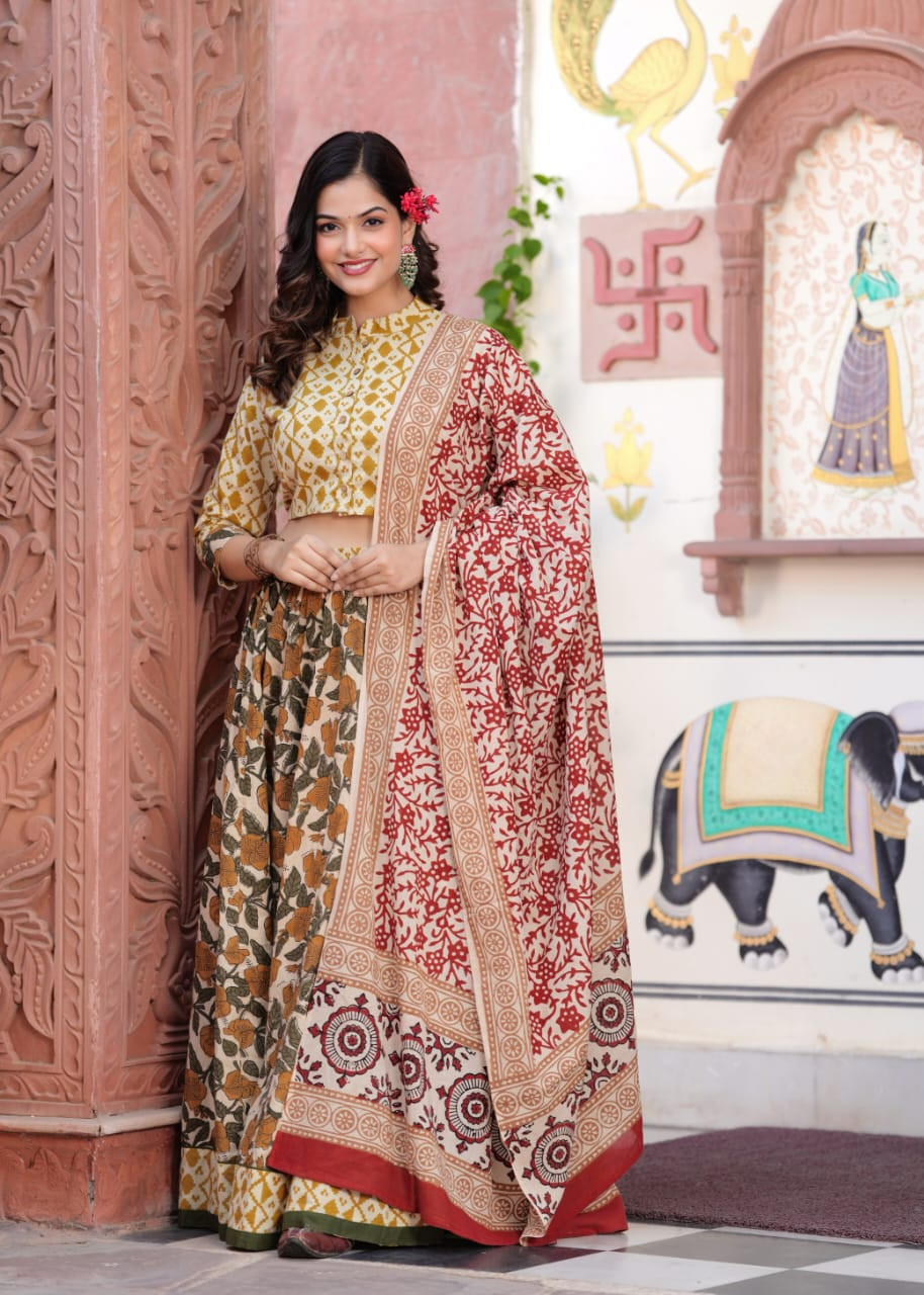 This vibrant ethnic ensemble is crafted from fine cotton fabric featuring a mix of geometric and floral block prints. The outfit consists of a mustard yellow crop top choli with a mandarin collar and button-down front, available in sizes 36 to 46 (S to 3XL) with a length of 15 to 16 inches. The matching lehenga skirt is 40 inches long and is designed with 28 kalis to provide a grand 5.5-meter flair that showcases a beautiful earthy olive and tan floral pattern. Completing the look is a 2.5-meter maroon dupatta adorned with intricate cream floral motifs and a thick printed border. This lightweight and breathable set is an excellent choice for festive celebrations, cultural gatherings, or traditional events where you want to combine classic craftsmanship with a voluminous silhouette.